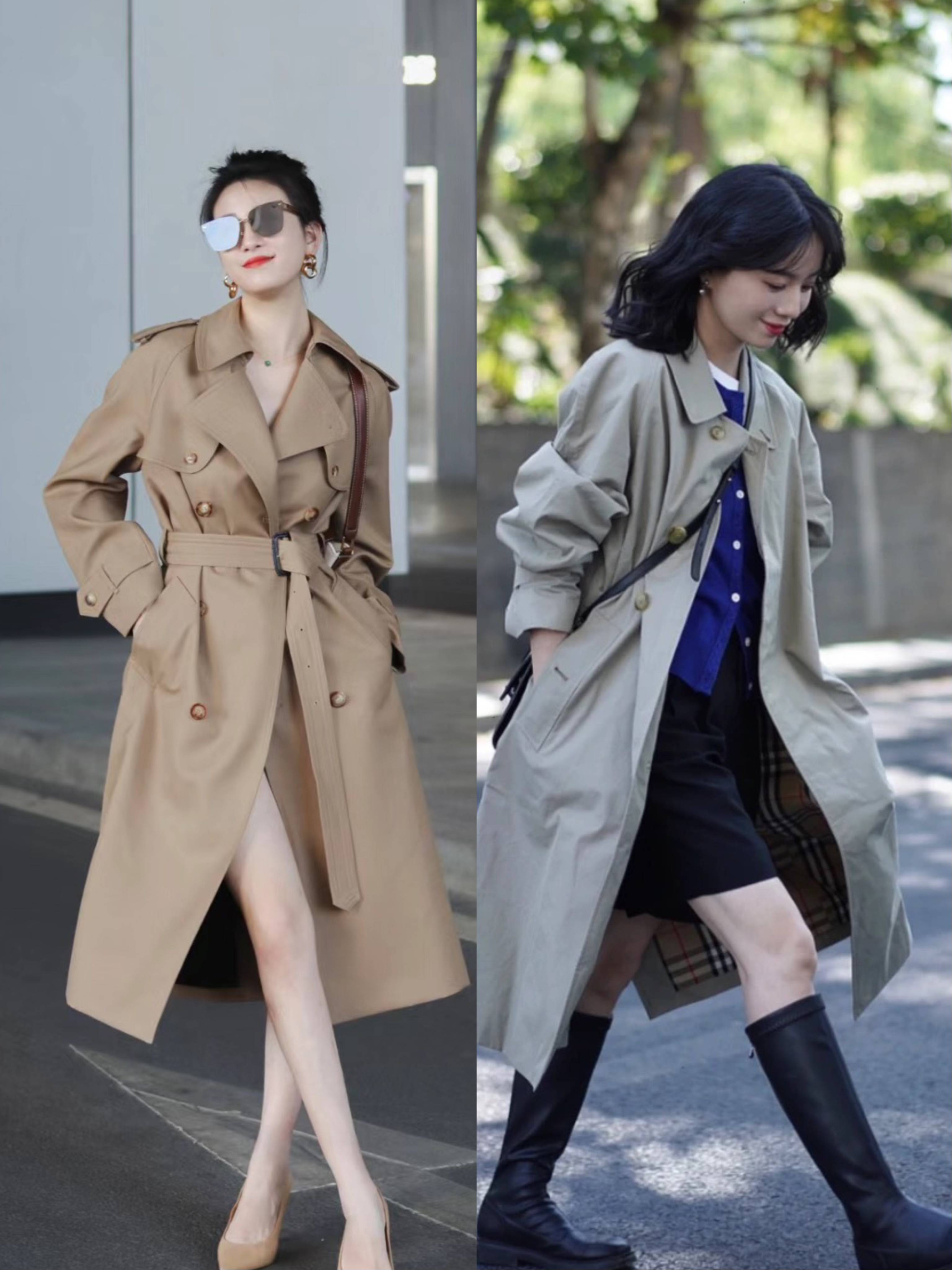 当我们选择风衣+连衣裙的组合时,连衣裙的搭配可以分为两种形式。一种是连衣裙的裙摆超过风衣下摆,更加温柔浪漫。