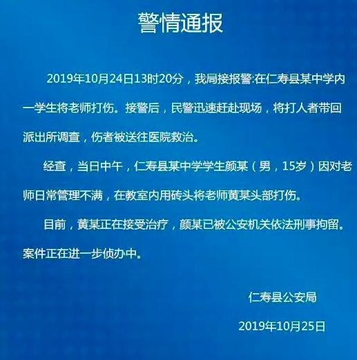 10月24日12时21分,仁寿县某中学一名老师从后门进入教室,